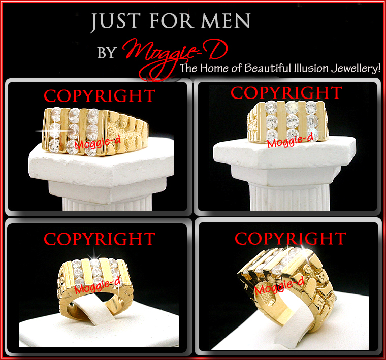 This sensational Men’s 10mm wide ring features 9 x 3mm (1.62ctw)round brilliant cut Created Diamonds which have been channel set between highly polished bars. A textured NUGGET pattern extends ¾ of the way down each shoulder of the ring to complete the design & the overall effect is sensational!